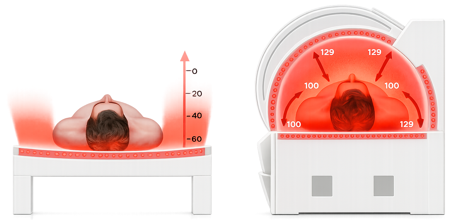 Full-body red light therapy is more effective because it delivers consistent therapeutic light to the entire body at the same time, rather than treating isolated areas. This allows cells throughout muscles, joints, skin, and tissues to absorb energy simultaneously, supporting system-wide benefits such as improved circulation, faster recovery, reduced inflammation, enhanced cellular repair, and increased energy production. With full-body exposure, the treatment is also more efficient, achieving a stronger therapeutic dose in a shorter session while ensuring even light distribution for maximum results.